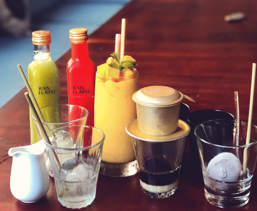 Quán phục vụ đa dạng các loại đồ uống như cà phê, trà, sinh tố và các món ăn nhẹ. Đặc biệt, Rainforest Coffee còn nổi tiếng với các món ăn vặt như xúc xích chiên, phô mai que, bắp xào và bánh tráng trứng nướng, được nhiều thực khách yêu thích.