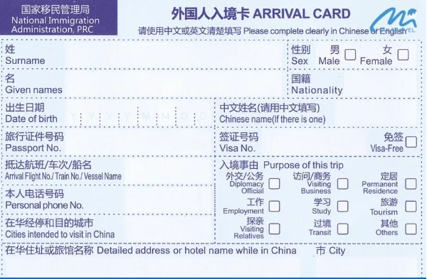 Tờ khai xuất nhập cảnh Trung Quốc là một loại giấy tờ do cơ quan quản lý xuất nhập cảnh Trung Quốc phát hành. Yêu cầu tất cả hành khách quốc tế (cả nhập cảnh lẫn xuất cảnh) phải điền đầy đủ thông tin khi làm thủ tục tại cửa khẩu hoặc sân bay. Thông thường tờ khai hải quan nhập cảnh Trung Quốc chỉ sử dụng tiếng Anh và tiếng Trung. Điều này dẫn đến một số khó khăn cho du khách khi muốn hoàn thành thông tin trên tờ khai.