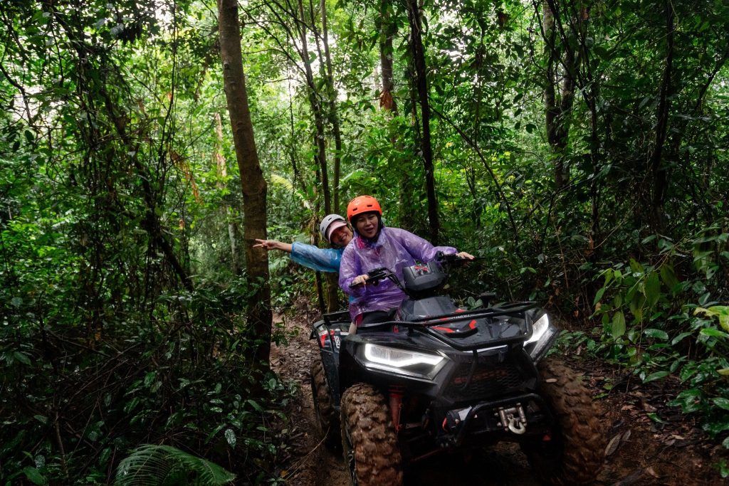 Lên xe địa hình, bắt đầu hành trình xuyên rừng hoang dã. Đường gập ghềnh, bùn đất bắn tung, cảm giác đầy phấn khích. Băng qua suối nhỏ, bánh xe rít vang giữa núi rừng. Cảm nhận sức mạnh động cơ giữa thiên nhiên hoang sơ. Mỗi khúc cua là một pha “rung lắc” đầy hào hứng. Gió rừng thổi lồng lộng, mùi đất, lá cây thoang thoảng. Đồng đội hò reo, tiếng cười vang cả cánh rừng xanh. Dừng chân giữa rừng, ngắm cảnh núi đồi hùng vĩ.