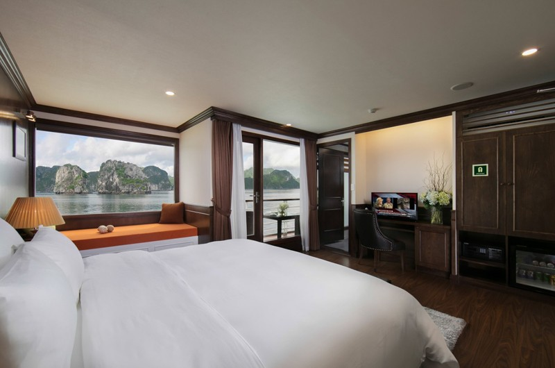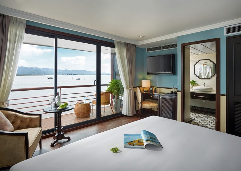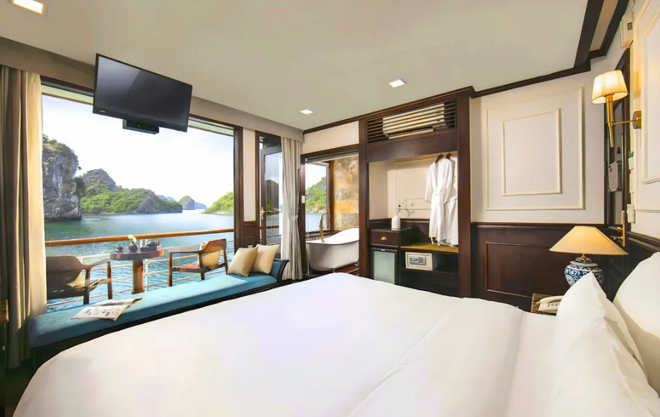 Cabin rộng rãi, sang trọng với ban công riêng hướng vịnh. Nội thất hiện đại, đầy đủ tiện nghi cao cấp. Trang bị bồn tắm, minibar, điều hòa và két an toàn. Hệ thống cách âm tốt, bảo đảm không gian yên tĩnh. Khu vực spa, lounge và sundeck rộng thoáng, thư giãn. Không gian lý tưởng cho nghỉ dưỡng riêng tư và thư thái.