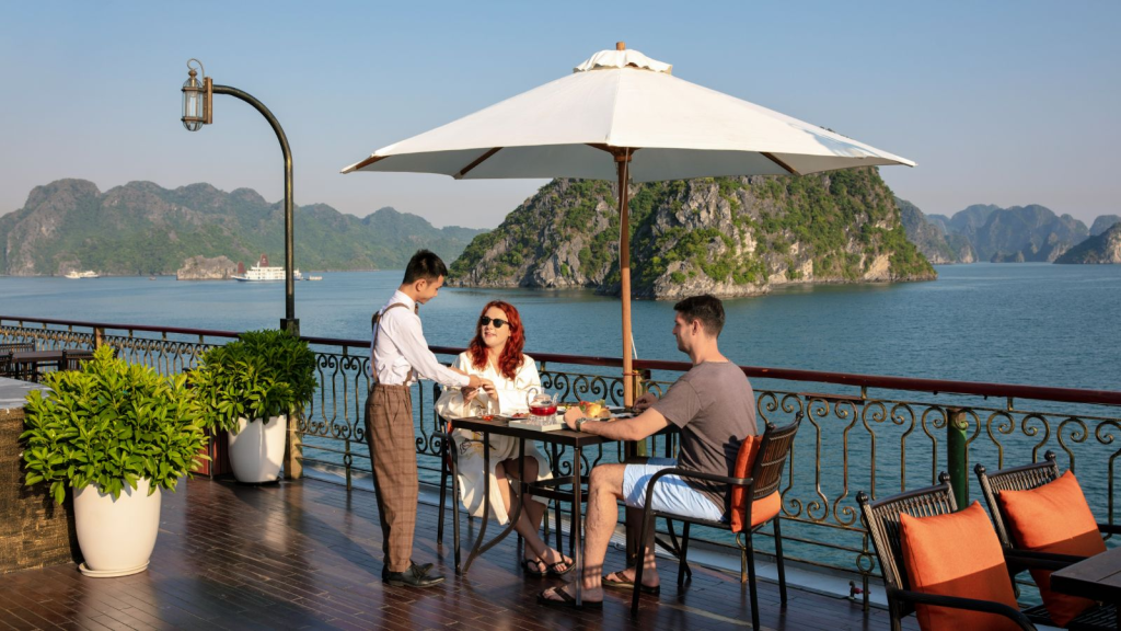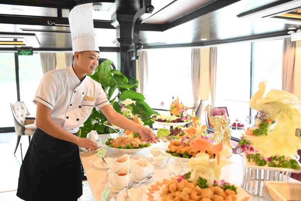 Ẩm thực trên du thuyền là điểm nhấn trong hành trình. Thực đơn kết hợp món Việt và ẩm thực quốc tế. Hải sản tươi sống được chế biến theo phong cách cao cấp. Bữa tối fine dining trong không gian sang trọng, lãng mạn. Bữa sáng và trưa phục vụ theo dạng buffet đa dạng. Nhân viên giới thiệu văn hóa ẩm thực vùng biển địa phương.