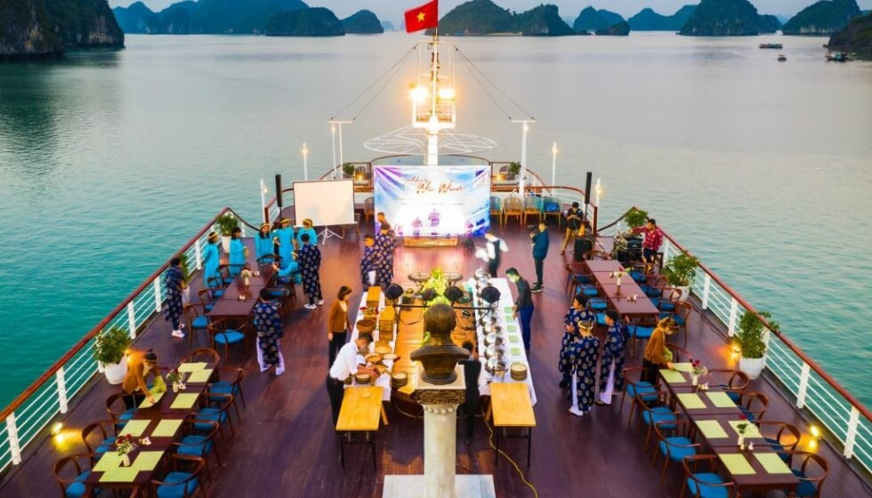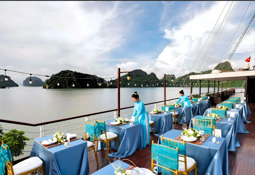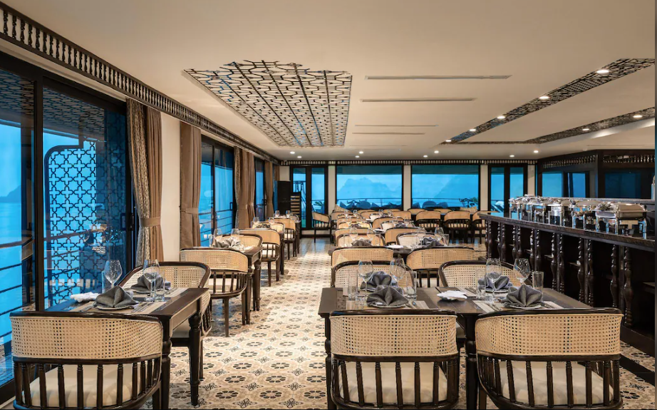 Ẩm thực trên tàu kết hợp tinh tế giữa món ăn Việt Nam truyền thống và quốc tế, đặc biệt là các món hải sản tươi ngon. Nhà hàng phục vụ theo phong cách fine dining với đội ngũ đầu bếp chuyên nghiệp. Du khách còn có thể tham gia các hoạt động giới thiệu văn hóa và ẩm thực địa phương.