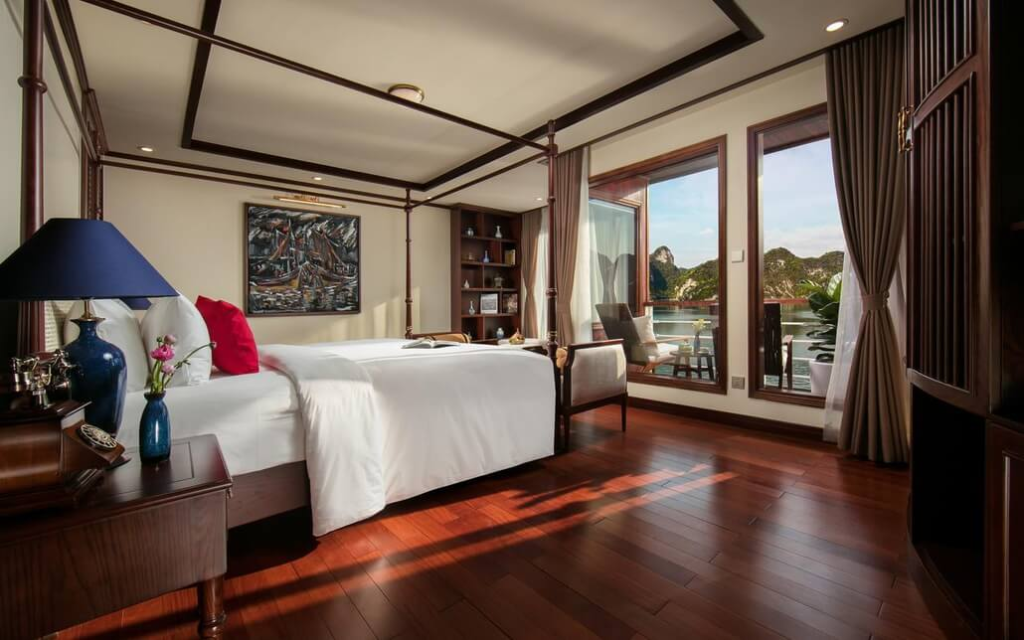 Indochine Cruise sở hữu 43 cabin rộng rãi với thiết kế thanh lịch, lấy cảm hứng từ kiến trúc Đông Dương. Mỗi phòng đều có ban công riêng, cửa kính lớn đón ánh sáng tự nhiên và phòng tắm hiện đại. Nội thất sử dụng vật liệu gỗ cao cấp, mang lại cảm giác ấm cúng và sang trọng.