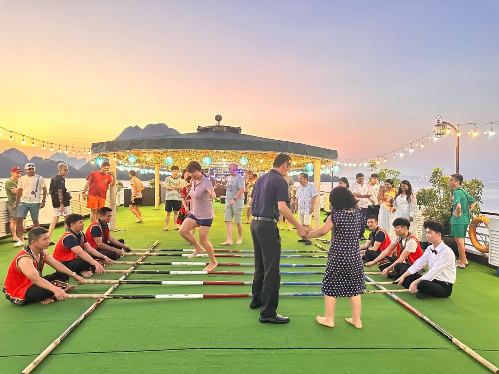 Ambassador Cruise mang đến nhiều hoạt động phong phú cho du khách. Bạn có thể thư giãn tại spa, thưởng thức âm nhạc truyền thống hay ngắm hoàng hôn trên boong tàu. Buổi tối, các chương trình giải trí nhẹ nhàng, tiệc cocktail và cả sự kiện bắn pháo hoa vào các dịp lễ lớn tạo nên không gian ấm cúng và lãng mạn.