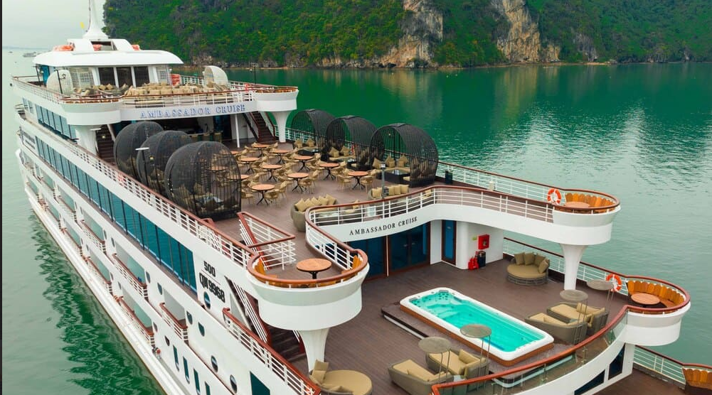 Ambassador Cruise sở hữu các cabin sang trọng với thiết kế tinh tế, tạo không gian riêng tư và thoải mái tối đa. Mỗi phòng đều có ban công riêng, nội thất hiện đại và tiện nghi đầy đủ như bồn tắm, minibar, điều hòa, két an toàn và hệ thống cách âm tốt. Các khu vực chung như spa, lounge và sundeck được bố trí hài hòa, mang lại sự thư giãn đẳng cấp và không gian yên tĩnh cho du khách trong suốt hành trình.
