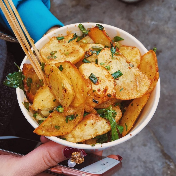 Với những tín đồ ăn vặt chắc có lẽ sẽ không bỏ qua món khoai tây trộn đầy ấn tượng. Từng lát khoai tây được thái lát to và trộn cùng nhiều gia vị hấp dẫn. Khiến ai trông thấy cũng phát thèm trước món ăn đặc biệt này.